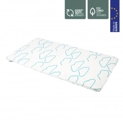 A 23 kg/m³ sűrűségű hab megfelelő tartást ad, míg a huzat 100%-ban újrahasznosított poliészterből készült, amely puha tapintású, kímélő a baba érzékeny bőréhez.