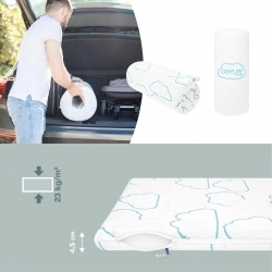A szállítás megkönnyítése érdekében a Cosy'Lite Nomad matrac könnyedén önmagára tekerhető, és az újrahasznosítható hordtáskájába (mellékelve) helyezhető.