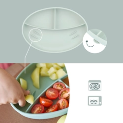 Egyedi kialakítású tányér, amely egy mozgásfejlesztő szakember közreműködésével készült – beépített peremeinek köszönhetően a gyerekek bal- és jobbkézzel is könnyedén darabolhatják az ételt.