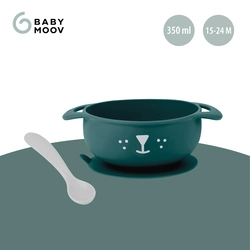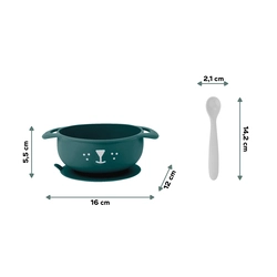A szett tartalmaz egy csúszásmentes szilikon tálat és egy puha, ergonomikus kanalat, amelyek segítik a finommotorika fejlődését és a helyes evési szokások kialakítását.